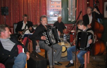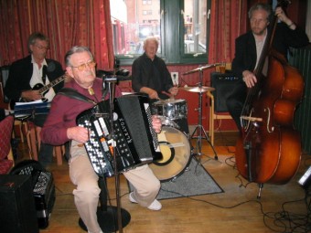 | Knut Lien, trekkspill med kveldens faste komp.: Bjørn Fredriksberg, kontrabass, Henry Slåtten, trommer, og Arne Bekk, gitar. Disse åpnet kveldens underholdning med en bukett fine evergreens. | Kveldens konferansier, Kjell Stensby, loset oss gjennom programmet og fortalte trekkspillhistorie. Han er "altetende" innen musikk, men liker best fransk trekkspillmusikk. Selv liker han for øvrig å spille viser av Prøysen, Taube og Vidar Sandbekk. |