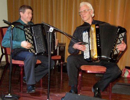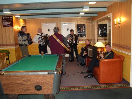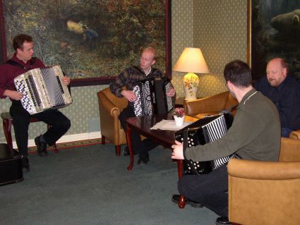 | Viktor Dukaltetenko (venstre) og Roar Knutsen var bl.a. med og akkompagnerte til Gudny Dahlens sang. | På hotellet var det musikk i hver en krok, slik som her hvor vi fant Knikt-laget fra Fron. |