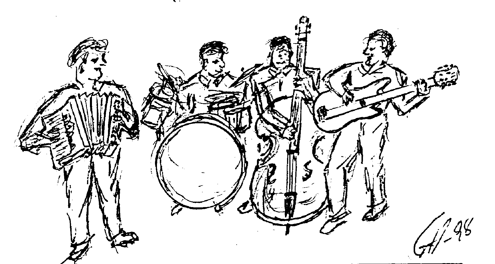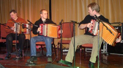 | Roymond øver seg til konserten dagen etter. En modig liten "buskspiller". | Denne gjengen (en del fra Slidringad'n) foretrakk buskspill på fredagskvelden, men stilte med dansespilling på lørdagskvelden med mer mannskap. |