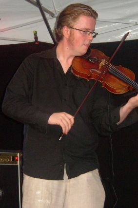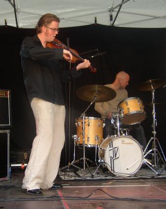 3kkspilltrollene tok seg en tur til Nilsson's café, som egentlig ikke var noen ordentlig café, men viste seg å være en "konstruert" utecafé med scene i en trivelig bakgård. Værgudene var tydeligvis på vår side etter å ha forsøkt å skremme oss med tordenskrall. Her kunne vi nyte en 2-timers konsert med "Stian Carstensen & venner". Trommeslager og bassist er "fast inventar" i Farmers Market. Ola Kvernberg har blitt anerkjent som en av landets beste jazz-fiolinister, og vi vet fra før at kombinasjonen Kvernberg-Carstensen med komp låter aldeles fortreffelig. Stians forkjærlighet til Balkan-musikk skinner igjennom på alle hans konserter, og det norske folk ser ut til å ha vendt seg til disse rytmene og taktartene som er langt fra 4/4-takt. Vi fikk smakebit på "Bulgarsk gammeldans i 11/16-takt" som startet med pols og endte med en kombinasjon av polka og sving. Uten stødig bassist og trommeslager hadde dette potpurriet med "ubemerkete" overganger vanskelig latt seg gjennomføre så glatt. Køntrijazz var kanskje ikke så gal betegnelse når Stian fant fram banjoen og Ola riktig fikk utfolde seg som solist på sin fiolin. Vi kunne nesten se for oss cowboyene på hesteryggen. Guttene har også sans for de virkelig jazzharmonier, og det var en nytelse å høre "Smile". Humor manglet det heller ikke på, og Stian fikk ene og alene lov å framføre Leif Justers nummer "Den tredje mann" med sang. Ønsker fra "salen" var det også mulig å få igjennom, og vi kan bare si at Køntrijazz-formen er kommet for å bli!