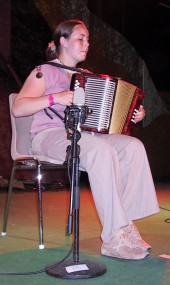 Kristin Gravaune (bildet) kom på andreplass både i denne klassen og i klassen for ”solo andre instrumenter, junior”, hvor hun spilte trekkspill. Det viste seg at flere gjorde som henne og stilte opp med både torader og trekkspill. Tom Berg er også en allsidig spillemann som trakterer både trekkspill og torader. Han vant klassen for ”solo durspill/torader, senior”. |