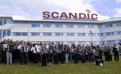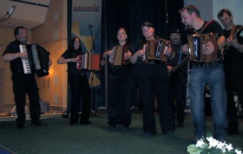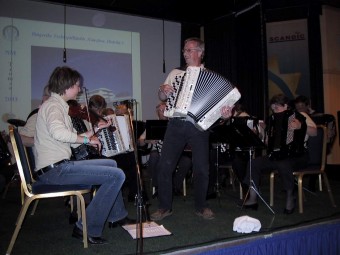 | Til ære for TV-innslag samlet mange trekkspillere seg for Scandic Hotel. Det ble spilt flere melodier i fellesskap og Dagsrevyen hadde til og med et lite innslag lørdag kveld. |
