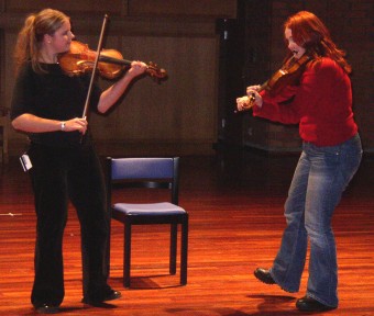 | Jorunn Marie Rypdal Kvernberg og Ragnhild Furebotten på fele. Begge er også med i Majorstuen spelemannslag. | Mange komposisjoner er i utgangspunktet skrevet for andre instrumenter enn trekkspill. Heidi Sandvik fremførte således utdraget Malagueña fra den spanske suiten, Andalucia, som opprinnelig er skrevet for klaver. |