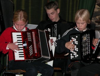 | Otto Kiss (i midten bildet over) bidrar også med lærekrefter til Spelemannskompaniet i tillegg til å være leder. Vi fikk høre "Klåfinger'n" av Bjarne Olsen og "Libertango" av Piazzolla i arr. av Lars Holm der de minste måtte stå over pga. vanskelighetsgraden. |
