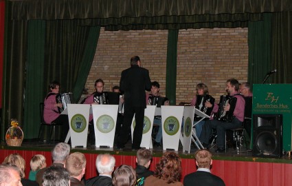 | Moss Trekkspillorkester åpnet konserten. Deres musikalske leder (med ryggen til) er for tiden Lars Gøran Engerdahl. | De framførte "MTO-marsj" av Jon Rudshagen og "Svisker fra Wien" - et Strauss-utdrag i arr. av John Rudshagen. |