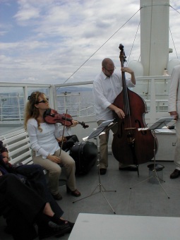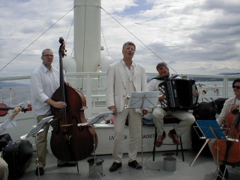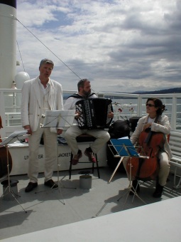 | Bal Musette åpnet sin konsert på øverste dekk med en melodi de vanligvis benytter som ekstranummer. Til tross for vokalist Leif Blix' meget tydelige tekstuttale, kan vi opplyse at melodien heter "Hender over bordet" og ikke "Henne overbord". | Franske viser fra 1920- og 30-tallet med tekster gjendiktet til norsk var i sitt rette element selv på vår norske innsjø,Mjøsa, denne fine sommerdagen. |