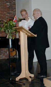 | 2re, Gamle Akers musikalske leder, her intervjuet av Ola, besøkende sjømannsprest, forteller de fremmøtte litt om våre planer under USA-oppholdet. | Roar Hensvold tok utfordringen på strak arm, da han ble forespurt om å traktere kirkeorgelet ettersom den faste organisten måtte svikte arrangementet....og ingen av oss kunne gjort det bedre. |