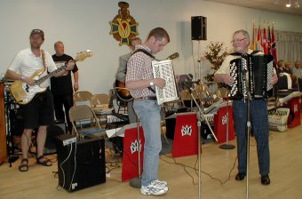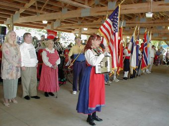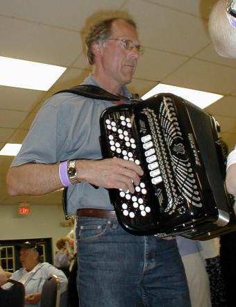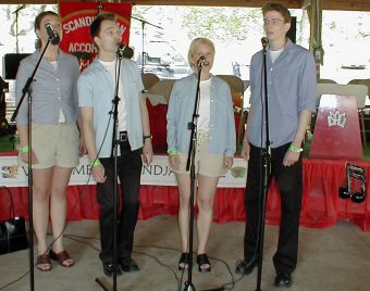 | Ellen Lindström fra SAC (Skandinavian Accordeon Club of New York) hadde ansvaret for lyden. | Peter Hedlund fra Sverige på nykkelharpa akkopagnert av sin sønn, Jonas, på skjeer. |