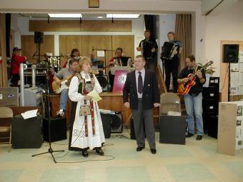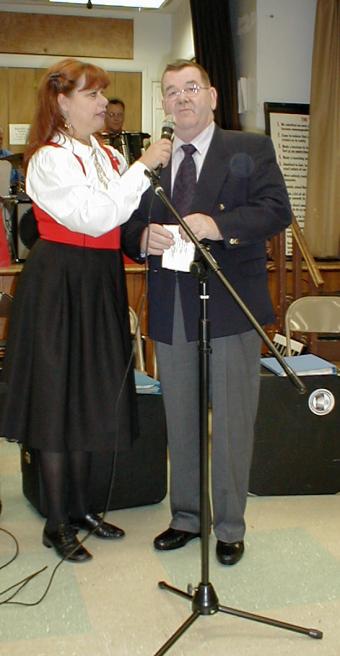 | Jeanne Eriksson Widman ønsker Odd Tom Risdal fra Øvrebø velkommen. Han har sunget på platene til hennes far, Walter Eriksson, på 60-tallet. | Allspill og allsang. |