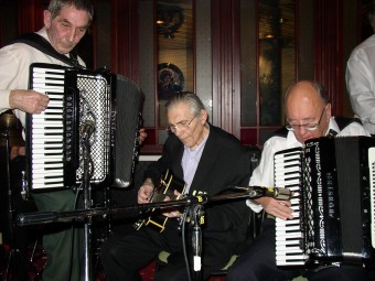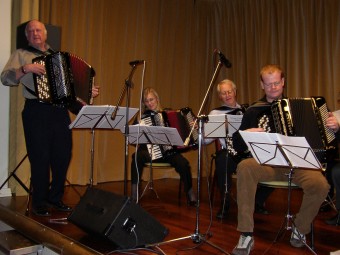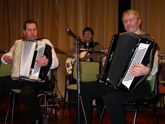 Olav Aunan (t.v.), Nils Johansen (begge trekkspill) og Kjell Antonsen på gitar.Disse serverte oss jazzrytmer. |