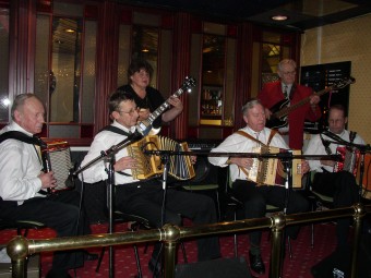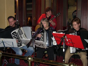 | Det var tydeligvis ikke nok scener på hotellet. Her i hotellets vestibyle hvor det var bare å slippe seg løs. | Tom Kjetil Tørstads orkester "tørrtrente" også med buskspill i hotellgangen. |