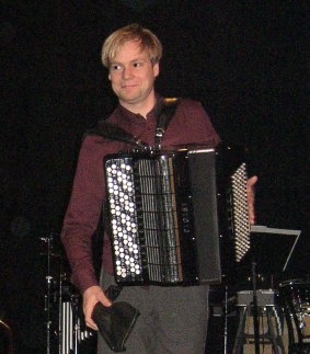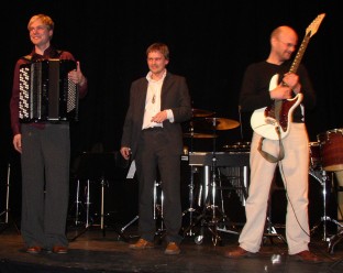| Frode Haltli synlig fornøyd med sin framføring av Arne Nordheims "Flashing". | F.v. Frode Haltli (akkordeon) fikk god hjelp av Erik Raude (slagverk) og Thomas Kjekstad (el-gitar). |