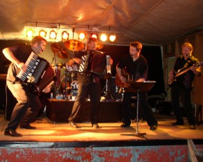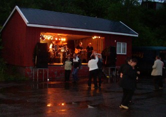| "Jhohans" spilte til dans på håndballbanen utendørs, mens gammeldansfinalen pågikk innendørs. Det manglet likevel (som vanlig) ikke på innsatsen. | Ikke helt optimale forhold for utendørs dans i regnvær på asfalt. |