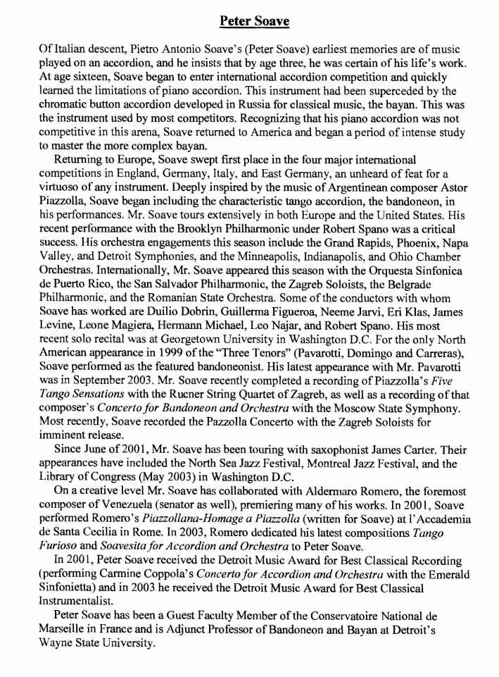 Da Florida Accordion Association fikk en henvendelse fra Orlando Philharmonic Orchestra om de kunne skaffe en trekkspiller som kunne medvirke på en konsert i Orlando 15. mai, var de ikke sene om å foreslå Peter (Pietro Antonio) Soave. Han er av italiensk avstamming, men har vokst opp i USA og insisterte allerede som treåring på å spille trekkspill, men måtte vente helt til han ble fem. Han har en lang merittliste og er idag blant de dyktigste trekkspillere i USA. Han er stadig på turne og har mange spennende oppdrag – se www.petersoave.com. I tillegg er han “Adjunct Associate Professor of Bandoneón and Bayan” ved Wayne State University i Detroit. Spesielt har han en forkjærlighet til Astor Piazzollas musikk. |
