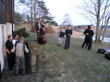 | "Oskar og Kajas kvartett". Fra v.: Arman Guthushagen (bass), Ella Guthushagen (8), Oskar Guthushagen (11), Kaja Ringerike (11), Ina Ringerike (8 1/2) og Erik Ringerike. | Store og små musikere falt for fristelsen til buskspill - eller skal vi heller si "fjøsspill"...... ;-)) |