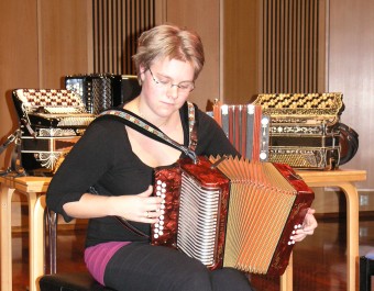 Ingunn benyttet også torader på konserten, men brukte kun den ytterste raden som en enrader. Hun spilte en ”laus” etter Eirik Thoresgard og demonstrerte hvordan det i eldre dager var vanlig å spille med ”liggende bass” i kompsiden. Temaet gjentas også ofte i det uendelige i eldre springare. |
