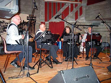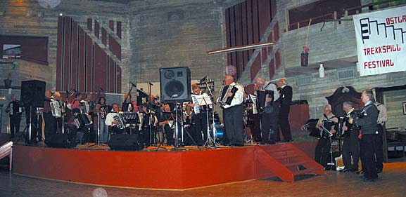 Lågdalsmuseet, som vartet opp med en utrolig fin sal i nesten ren betong ispedd litt furu. Høres ikke så fint ut? Joda, det er sjelden å se en finere sal. Den satte rammen rundt et vellykket og innholdsrikt arrangement. Først konsert og deretter dans. Tonen ble slått an av arrangørklubbens hovedorkester - det er nemlig et yrende trekkspillmiljø på Kongsberg. I tillegg til klubben stilte Kongsberg med 4 lag til! Alle var av høy kvalitet og ikke minst med et variert innhold. En stor og allsidig klubb som skal ha ros for gjestfrihet og fin musikk. Publikum hadde gleden av å få en serie godbiter servert. Ringerike TK, Strømmen TK, Modum TK, Drammen TK, Moss TK, Halden TK og Eiker trekkspillgruppe sørget for melodier i et rikt utvalg taktarter. Innimellom ble det løst opp på en fin måte av mindre grupper fra arrangørklubben som har mange unge dyktige medlemmer. |