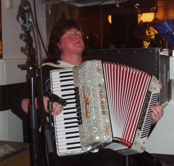 | Eva T. Haugland i "Hauglands Orkester" - dypt inne et sted i musettevalsen "Indifference"... | ...i godt samspill her med Geir H. Haugland (trekkspill), Harald Rudi (bass) og Roy Enger (gitar). |