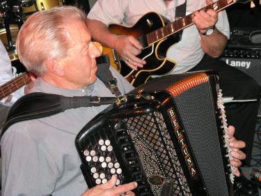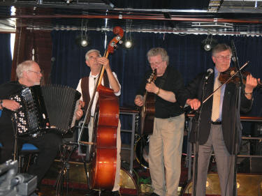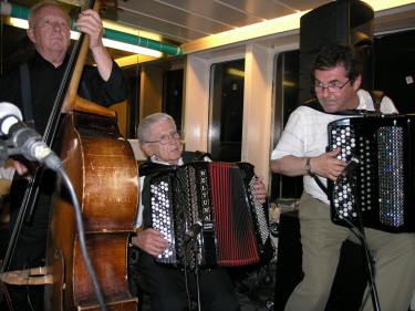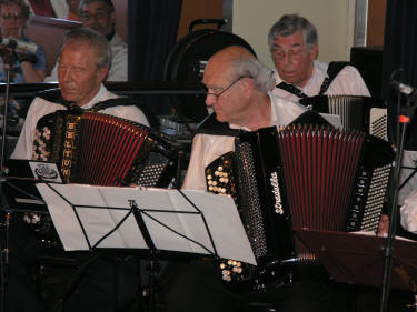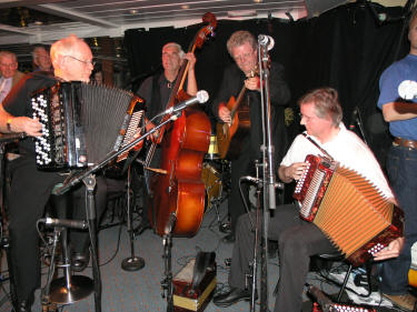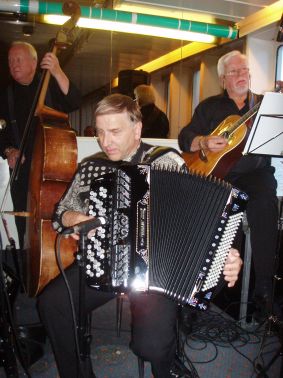 Trekkspillveteranene fra Oslo holder det også imponerende nok gående. Her ser man levende bevis på at alderen i alle fall ikke er til hinder for musikalsk deltakelse, og i orkesteret finnes også Arnstein Johansen som like godt fant ut han kunne feire sin 80 års-dag ombord på "Peter Wessel" som noe annet sted. Han kunne vanskelig unngå mye oppmerksomhet i denne anledning. Blant ”buskspillerne” i kafeen, fant vi bl.a. "Hauglands orkester" som fremførte melodier fra Arnstein Johansens repertoar og også flere av hans egne komposisjoner. |