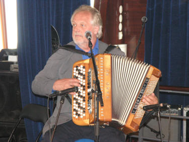 | En etterlengtet gjenforening av "Nordkappkvintetten" med desidert lengst reisevei skjedde ombord under konserten i "Dynekilen". På trekkspill f.v.: Karstein Pettersen og broren Bjørnar Pettersen. | Den tredje trekkspilleren i "Nordkappkvintetten" trenger knapt presenteres - Kjell Harald Langhaug. Han hadde også sin egen soloavdeling før gruppas opptreden. |