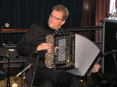 | Håvard Svendsrud - engasjert som taffelmusiker (du ser ham bak rekebollen ;-)) | Christiania Trekkspillklubb (CTK) var med på cruiset for å feire sitt 30 års-jubileum. |