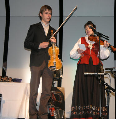 | Randi Torgersen forklarte publikum om de ekstra strengene på hardingfela. | Ola Kjorstad fra Gudbrandsdalen framførte helnorske "Fanitullen" |