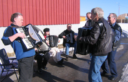 | Utespilling - bokstavelig talt - - men buskspilling ? på denne tiden av året, nei.... snøfonnspilling -? Men et utrolig vakkert vårvær får stemningen opp før søndagens matiné. | Den gamle trekkspillhulken |