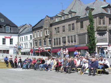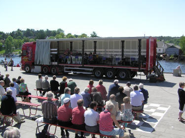 | Etter endt spilleøkt svingte noen av "Mossingene" seg etter fengende swingrytmer fra Einar Sandviks kvartett. | I tilfelle regnvær hadde i alle fall musikerne sittet tørt, men det spørs vel om benkene hadde vært tomme. |