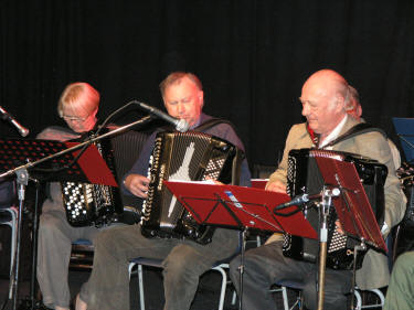 Det er aldri for sent å starte der man slapp – selv om det er mer enn tjue år siden. Frank Andresen (t.v.) og Tore- A. Ødegård (t.h.) hadde gjenopplivet gamle ”kunstner” og fremførte ”Tango Simoni” og ”Synkende sol” av Erling Eriksen. For anledningen hadde de med seg Roar Hensvold (midten)som en god støttespiller. |