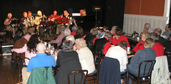 Gamle Aker Spelemannslag som holder til i Oslo var først ut på scenen. Besetningen talte elleve utøvere, og de betrakter seg selv som ”innvandrere” ettersom de aller fleste har sin opprinnelse fra andre steder i Norges land. Under framføringen av et allsidig norsk og svensk gammeldansrepertoar som er bygd opp over en ti års periode, hadde kanskje flere lyst til å danse, men dette lot seg vanskelig gjøre av fysiske arealbegrensninger – det måtte i så fall bli på bordene. |