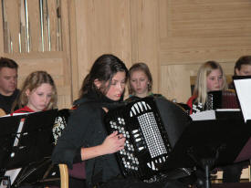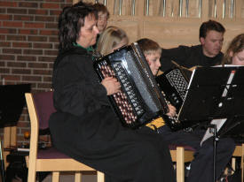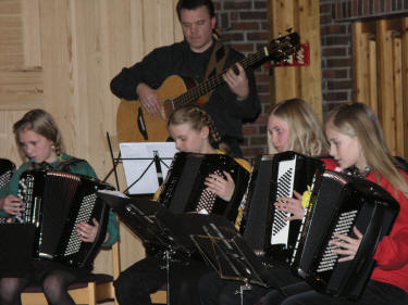 Og endelig var det selve arrangørenes tur der de minste elevene er med i MSKs rekruttorkester. Per Emil Grimstad har nylig overtatt lederoppgaven for rekruttene, og de fremførte to av hans egne komposisjoner ”Rekrutt” – en tango basert på ”Hvem kan segla” og ”Prompepolka”. Under fremføringen av S. Bjørstads ”Walt Disney Music” med hjelp av Sofie på sang, gikk tankene tilbake til fjernsynets Disney-julekavalkade før parabolantennens fødsel. De avsluttet som tidligere nevnt med ”Tico Tico”, og vi regner med at mulige tilstedeværende representanter fra menighetsrådet allerede for lengst har tilgitt både påkallelse av heksedoktorer og sambadans. |