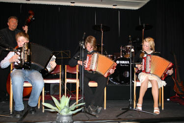 | Elever ved den kommunale musikkskolen deltok på konserten | Andres Nibstads barnebarn i aksjon under konserten: Andreas, Simen og Fredrik |
