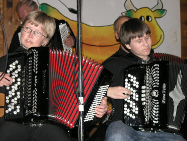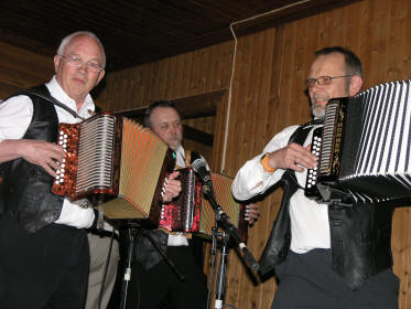 | Initiativtaker Pelle Edlund, ikledd slips dekorert med kuer, er å finne både i Strømmen Trekkspillklubb og i ”Etter fjøstid” og var ikke helt sikker på om dette er 12. eller 14. gang. Det at man har kommet ut av tellinga er uten betydning når interessen for treffet stadig er stigende. Med god orden og styring på spillelista, gikk sceneskiftene mellom årets 14 inviterte grupper fint etter planen, mens de 5 gruppene som stod på venteliste, var det dessverre ingen mulighet til å presse inn. |