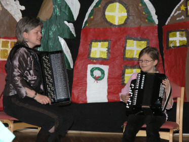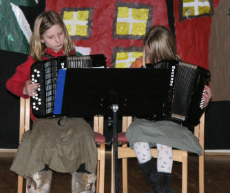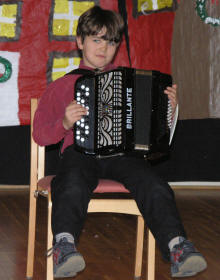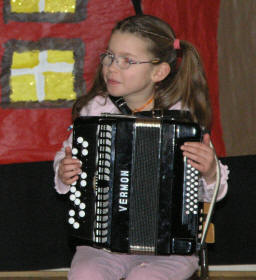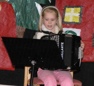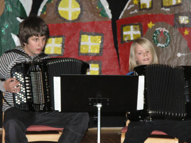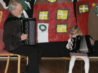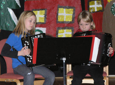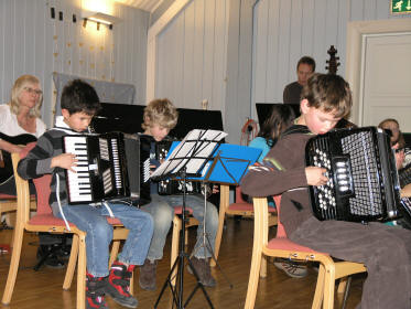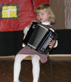 Etter å ha skummet fort igjennom det innholdsrike to siders programmet, tenkte vi at muligens måtte natten tilbringes her også, men trekkspillærerne og arrangørene Brit Laila Ouff og Anders Grøthe er vant til å håndtere barn, og sceneskiftene gikk utrolig glatt. De presiserte at denne gangen skulle alle som ønsket å spille på konserten få anledning. Første avdeling var avsatt til solister og duetter. For flere av de minste var dette deres ”debut”-konsert, og man kan selv tenke seg til hva som skal til av mot når en 4-5 åring har 50 par øyne stirrende på seg. Noen syntes det var trygt å ha læreren der med litt bistand når det ble for skummelt, deriblant vesle Anna Ouff Grøthe som fremførte ”Så går vi rundt om en enebærbusk” i duett med pappa Anders. Litt adrenalin kan være spennende for de minste også, og de fleste strålte på vei ned fra scenen – tydelig fornøyd med sin egen prestasjon, noe vi klart må si oss enig i. |