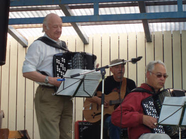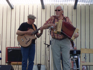 | Halden Trekkspillklubb tok dagens øvelse utendørs | Allan Levin (t.v.) og Roy Enger med trekkspillkos i sola |