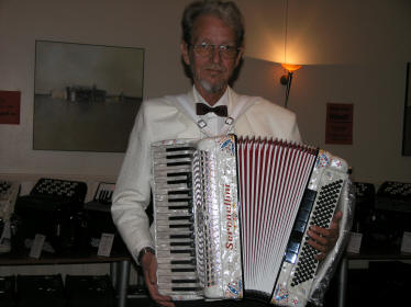 | Jan-Egil Schjølberg - for anledningen avbildet med et lånt Serenellini musettetrekkspill fra utstillingen til "3kkspilltroll". |