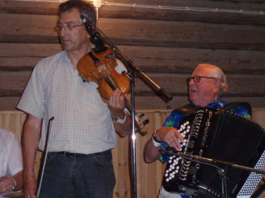 | P. A. Røstad jr. (t.v.) var også med i Asmund Bjørkens Orkester | Asmund Bjørken med sønnen Ove Bjørken på fele |