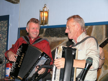 | Roy Enger og Harald Rudi med litt fransk under konserten på lørdag. | Musikkinteressen ble også vekket blant kjøkkenpersonalet. Kokken hadde nesten tårer i øynene da han for første gang på tolv år fikk låne en kontrabass og kompet taffelmusikkpianisten i spisesalen. |