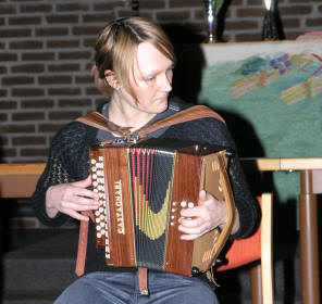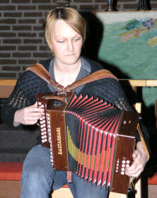 | Det virket med ett litt tomt etter de mange Trekkspillveteranene, da det stod kun én enslig stol foran alteret. Den var tiltenkt neste artist – Mona Holm fra Sørskogbygda på Elverum. Men da konferansier Frank Andresen leste opp denne toraderjentas rikholdige merittliste med bl.a. verdensmestertittel i Tyrol fra 2003 og 9 gull i NM, visste vi jo fra før at hun klarer å fylle ethvert rom som måtte virke tomt helt opp til randen med sin store musikk på et lite instrument. |
