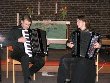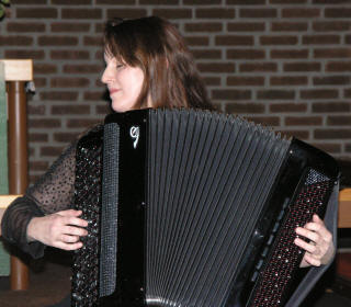 Kveldens siste artist, trodde vi, var Lena Rist-Larsen. Hun er utdannet både på fiolin og trekkspill fra Norges Musikkhøgskole, og debuterte i Aulaen i Oslo på trekkspill i 1996. Lena har hatt et allsidig frilansliv, og våren 2007 er hun engasjert som trekkspiller ved Oslo Nye Teater i ”Spellemann på taket”. Hun startet med å spille fransk barokkmusikk – ”3 bagateller” (Den skremte sissiken, Sivene og Vindmøllene). Deretter hoppet hun flere 100 år frem i tid. ”Ved bredden av det evige sekund” skrevet til trekkspilleren Geir Draugsvolds debutkonsert av M. Åm, trengte litt forklaring av Lena før hun satte i gang. Vi tenkte at med 3 ulike rytmer gående oppå hverandre og hvor man ikke finner eneren i taktslaget, måtte dette bli vanskelig å forstå, men Lena fremførte det på en elegant og fasinerende måte. |