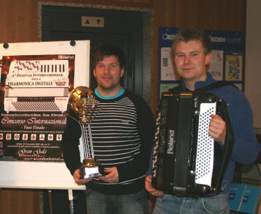 Stor jubel Det ble stor jubel i den norske leiren da Kai Andre Hansen og Glenn Sørskår ble utropt til vinner av Ensembleklassen. Størst var overraskelsen for dem selv når de kom ut på scenen for de hadde ikke forstått eller hørt et ord av hva som ble sagt da alt foregikk på italiensk. Men smilet kom fort da de fikk den største pokalen i hendene og fikk overrakt sjekken på 5000 Euro. Daglig leder for Roland Scandinavia i Norge, Jo Bergerskogen, var raskt på scenen for å gratulere vinnerne. Han syntes dette var utrolig morsomt og var meget stolt over de flotte fremførelsene av både Ragnar Johnsen, Glenn Sørskår og Kai Andre Hansen. At det skulle holde helt til topps var helt fantastisk. Jo Bergerskogen kan fortelle at 20% av det totale antall V-Accordion som har blitt solgt på verdensbasis har blitt solgt i de skandinaviske landene, så interessen her nord er veldig stor. Han håper at denne seieren i den første internasjonale konkurransen kan bidra til at interessen for konkurransen blir ennå større neste år, for dette er tenkt å bli en årlig foreteelse. |