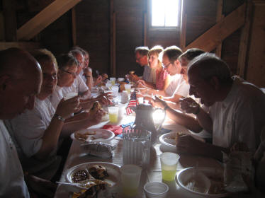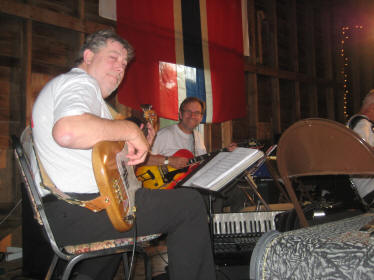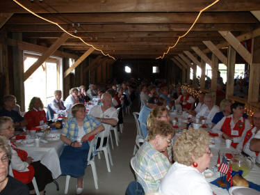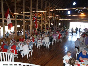 Etter avhenting av tre ”trekkspillbusser” – les ”mini-vans” - med god bagasjeplass og noen timer ”på øyet”, var det bare å legge ut på kjøreturen fra Minneapolis til Grand Forks via Fargo i North Dakota. Landskapet er ikke av det mest spennende, men til gjengjeld går det radig selv om strekningen kan virke lang. Første spilleoppdrag var for Sons of Norways distriktkongress. Vi fikk beskjed om å følge en av de store bussene ”langt utpå landet” til Draxton Farm. Her foregår oppdrett av 7.000 kveg, og den gamle låven fra 1903 er tatt vare på og omgjort til festlokale. Bevertningen i låven foregikk med hvite duker på bordene, og vi fikk underholde et par hundre publikummere i nesten to timer etter middagsserveringen så svetten silte. Her var det mange danseglade som fikset både hambo, masurka og polka. |