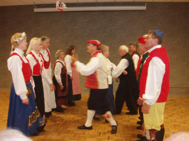 En norsk-amerikaner lengter alltid ”hjem”. Derfor har de laget et eget Hjemkomst senter i Fargo med en Scandinavian Hjemkomst Festival. Midt i bygget står et gedigent vikingskip og på plassen utenfor finner man en stavkirke. Her er det hvert år samling med skandinavisk mat, folklore, dans og musikk. GAS var meget stolte over å bli presentert som en av hovedattraksjonene hva gjaldt musikk, sammen med Bröderna Trück fra Sverige. Sons of Norway, Kringen Lodge i Fargo arrangerte også St. Hans fest med kåring av en ekte St. Hans, og her var vi engasjert til å spille til dans hele kvelden. |