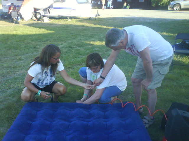 Det er ikke bare i belgen det trengs luft, noen var framsynte og forberedte muligheten for et par timer med hæla og nakken nedpå utpå morgenkvisten. Anita Nesselquist, Christin Øra og John Rudshagen i Moss Trekkspillorkester - funderte på om kompressor'n også kunne brukes til trekkspillene |