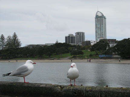 | Takapuna beach | Ikke noe strandliv ennå annet enn for måkene, da 1. vårdag var 1. september |