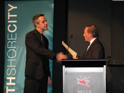 | Utsikt over til Sky Tower downtown Auckland fra hotellrommet på Takapuna, North Shore | Prisene for 1., 2. og 3. plass i hver klasse var en statuett laget i eldgammelt kauri-tre fra New Zealand |