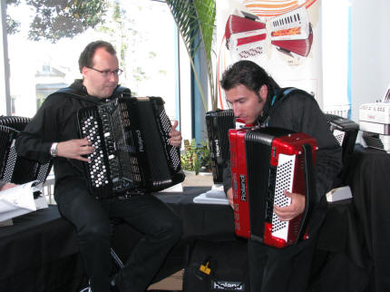 | Ludovic Beier fra Frankrike var invitert som Roland V-accordion gjesteartist. | Ludovic Beier på Roland-stand med Cory Pesaturo, vinneren av den nyinnførte klassen for digitale trekkspill |