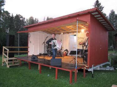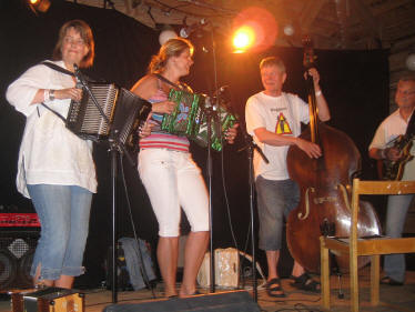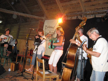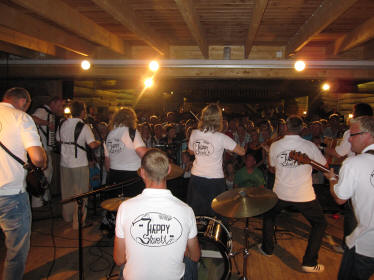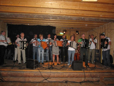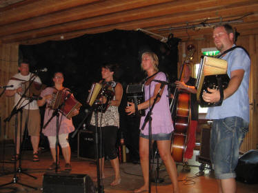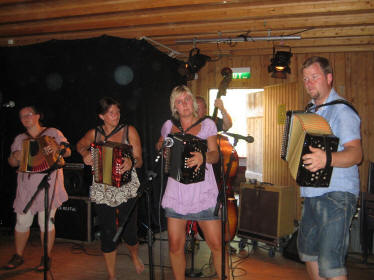 | Slik ser det ut for Happy Skvett når de har det artig på scenen og det smitter over på publikum. | Kremmerns venner fra Sokna - lørdagen spilte de inne på Loge C og denne gangen med mikrofoner og lydanlegg ;-) |