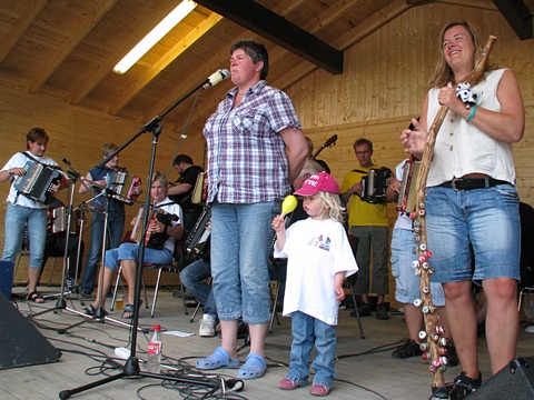 "Skal tidlig krøkes" ... og det er en viktig jobb å holde styr på takten for så mange toradere ... Skinnesmoens yngste deltaker, mon? samt det særeste rytmeinstrumentet vi kunne observere på hele festivalen |