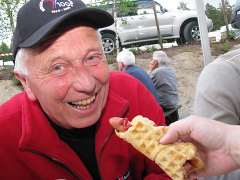 En mossing ga selvfølgelig ekstrapoeng til festivalarrangørene for å servere pølse i vaffel - en mosse-spesialitet. John Rudshagen vet å bite fra seg, og sørger for å ha litt å gå på til spilleøkten med Moss Trekkspillorkester seinere på kvelden. |